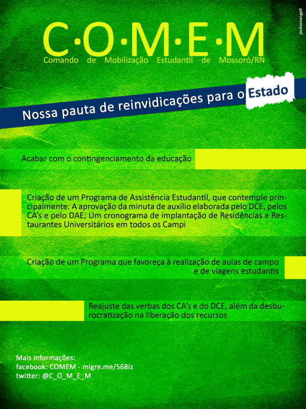 Fazem parte do Comando de Mobilização Estudantil estudantes da UERN, UFERSA, Escolas Públicas e Particulares. O grupo é aberto para que os estudantes que estão preocupados com a Educação do Estado e do país. Convocamos a sociedade para debater e lutar em favor da educação de qualidade para todos os potiguares.