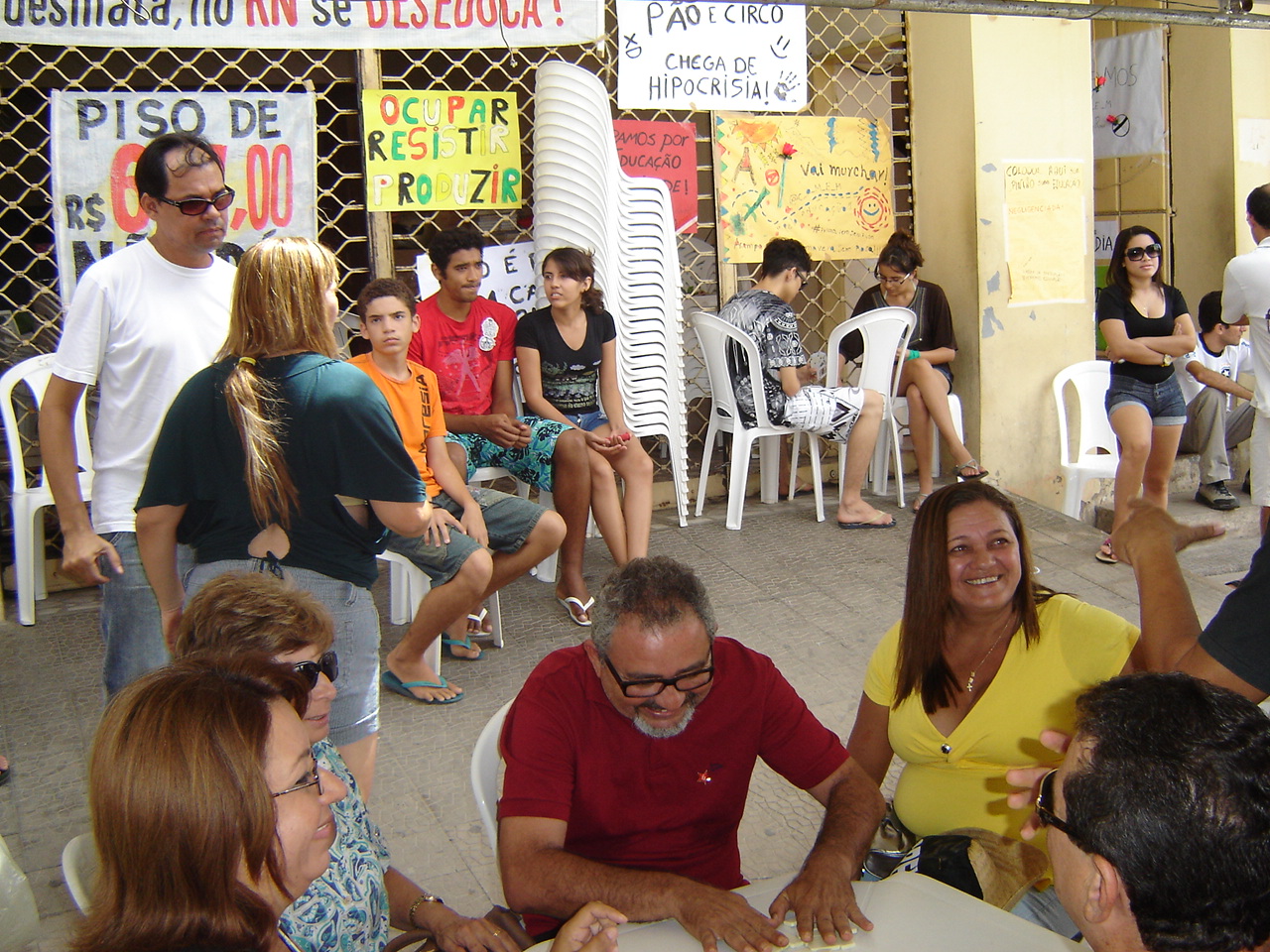 Ontem, sábado, o SINTE ,em conjunto com a ADUERN e o COMEM, promoveu o “Pingo da Mei Dia” da greve. Professores, estudantes, poetas e cantores estiveram reunidos para mais uma manifestação.
