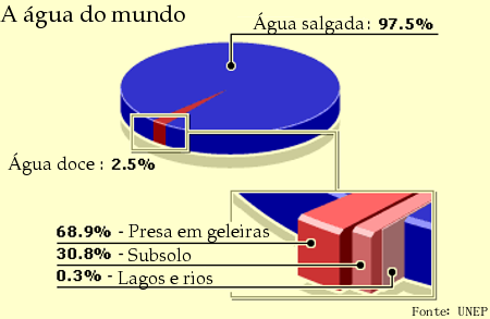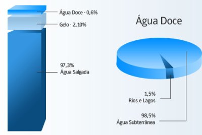 Uma analogia que podemos apresentar aqui diz respeito à quantidade que teríamos de água no planeta e a quantidade que realmente podemos utilizar de água doce para nossa sobrevivência. Então, se a reserva de água do mundo tivesse apenas cem litros, nossa reserva utilizável de água doce seria de apenas 0,0014 litros ou 2,5 colheres de chá. Lembre-se, a água doce que dispomos para nosso uso, parte dela, não está tão acessível. Veja figura abaixo.