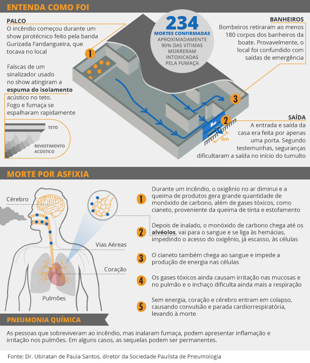 O site da Uol notícia, seção cotidiano, colocou um infográfico mostrando os compartimentos da boate e as possíveis causas das mortes. Veja abaixo:
