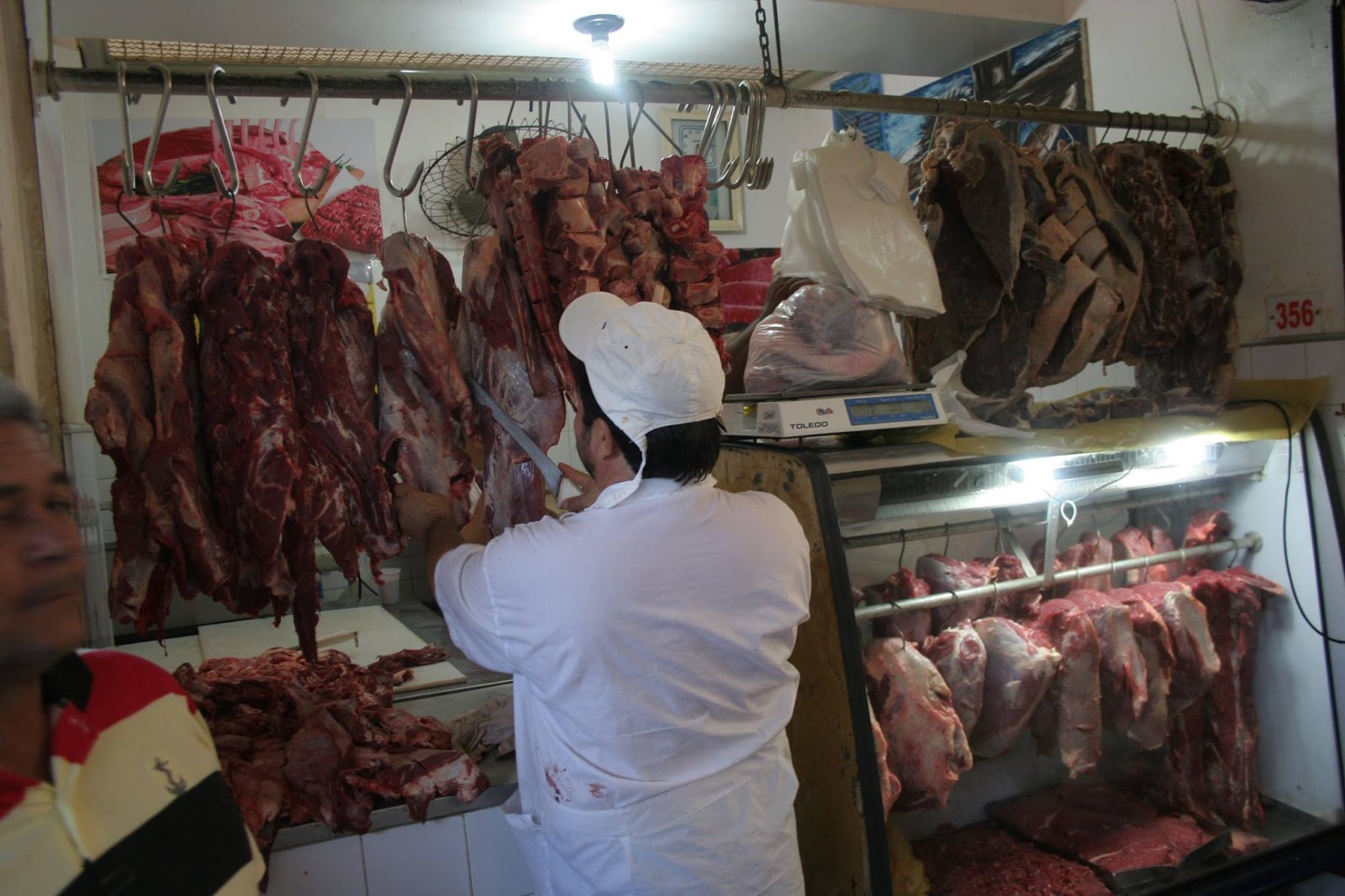 É nessa algazarra de gente e som, em cujos espaços ecoam sons de serras cortando ossos e carnes, máquinas trituradoras em pleno funcionamento, batidas de facão partindo o bode e a cabra no sentido longitudinal e transversal, conversas entre grupos de pessoas, vendedores gritando as promoções, onde um comprador estava parado em uma banca olhando atento o açougueiro mostrar seu produto, uma carne que estava a venda num balcão sujo de sangue no qual as moscas sobre voavam o corpo do animal cortado em postas, só esperando os dois senhores saírem de perto para pousarem. – Veja só, é vinte (reais) o quilo – aponta o açougueiro para um grupo de carne do mesmo tipo – Esta aqui é da boa! (Leia-se com pouca gordura, macia, carne fresca). Vai querer? Na banca vizinha outro comprador observa atento o marchante colocar à vista o mocotó de boi, cupim, picanha e logo em seguida grita a promoção do produto.
