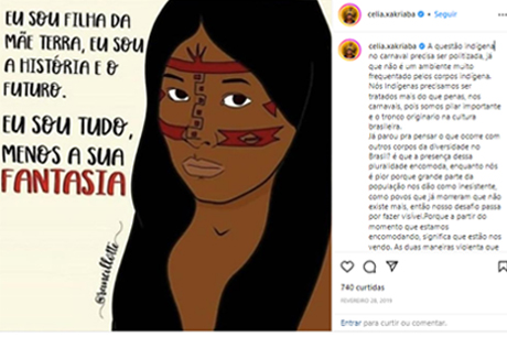 > foliões com trajes de indígenas. Questão que está em debate atualmente. Em 2018 foi lançado uma cartilha sobre o uso da fantasia indígena, a ativista Katú Mirin encabeçou o manifesto. Em 2019, a indígena Célia Xakriabá publicou em seu instagram a seguinte mensagem: