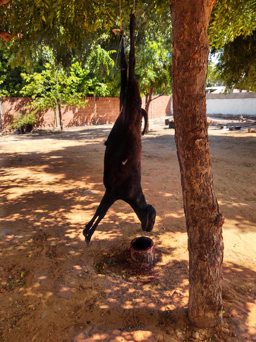 Assim que saí do corredor deparei-me com ele, ainda amarrado na árvore frondosa, mas agora estava pendurado, de cabeça para baixo, morto e sangrando. Um recipiente aparava o líquido vermelho intenso; sangue vivo, como dizia minha avó.